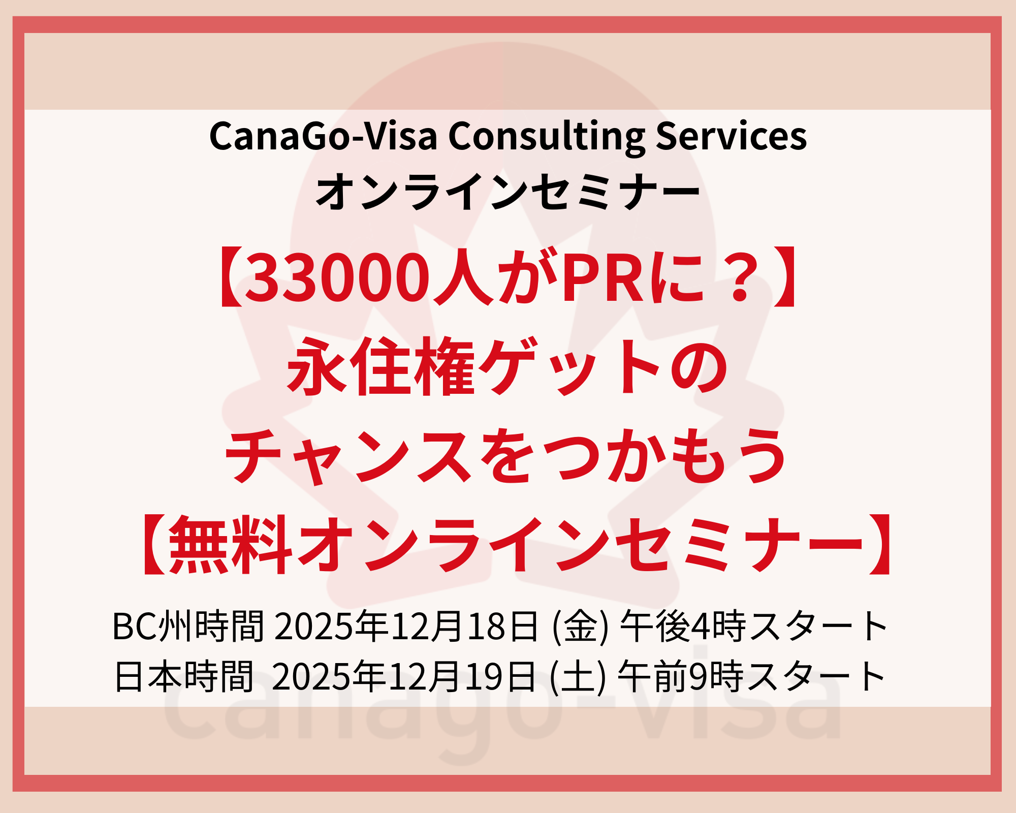 📢 無料オンラインセミナー開催! 🎓 「ファミリークラス永住権」セミナー 💬「カナダ人や永住権を持っているパートナーと結婚が決まったけど、何から始めたらいいかわからない」「 […]